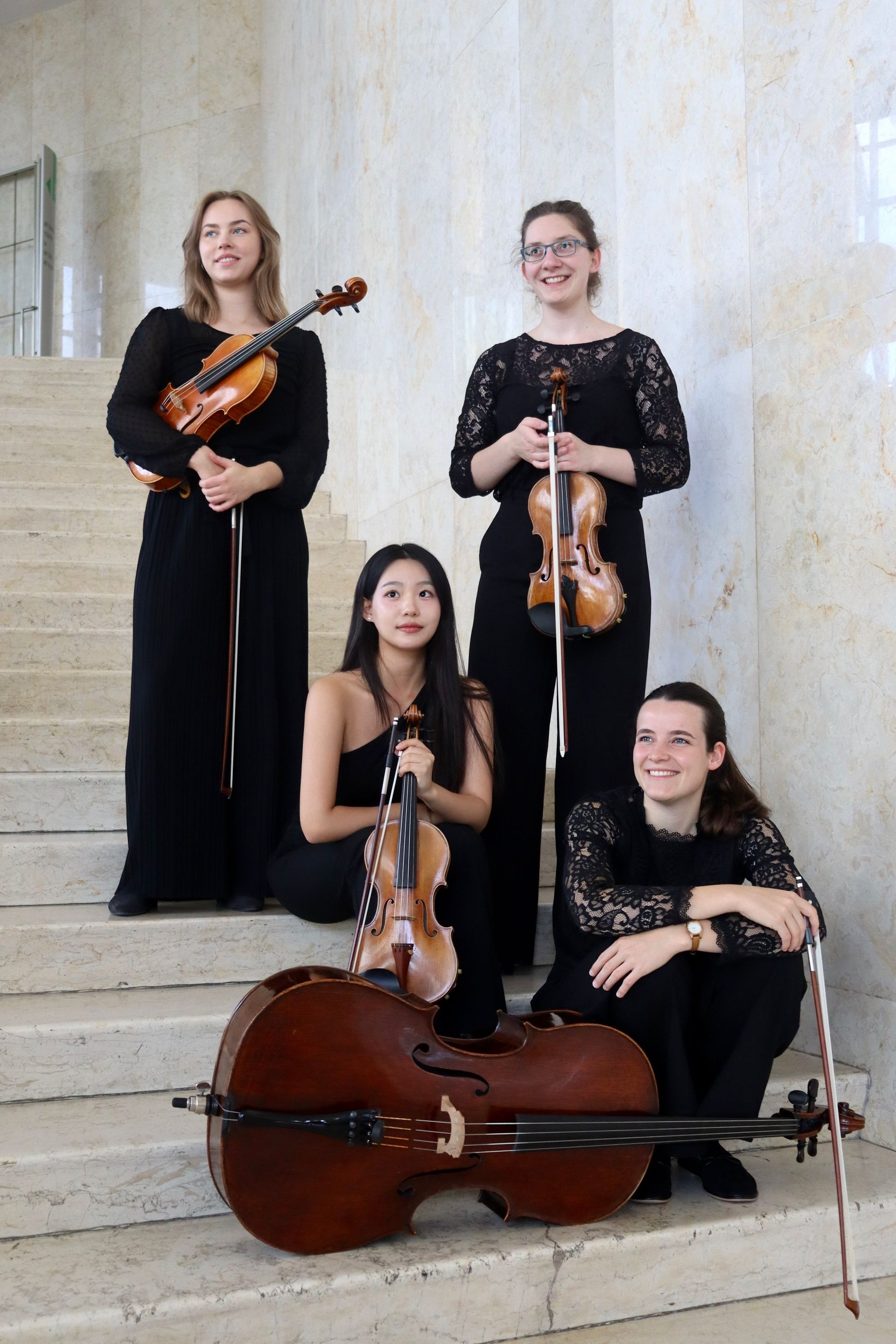 Wenn man alte Darstellungen von himmlischer Musik betrachtet fällt auf: Es sind fast immer Geigen, die beteiligt sind. Und natürlich hängt der Himmel „voller Geigen“, wenn wir richtig verliebt sind. Und Streichinstrumente vor allem natürlich das Cello ( ;-) ) haben eine besonders enge Verwandtschaft im Klang zur menschlichen Stimme. Für Komponist*innen galt und gilt: Werke für Streichquartette bildeten immer die „Hohe Schule“ der Kompositionskunst. „Reine Musik“ ohne irgendwelche effekthascherischen Klänge durch die Beifügung von alternativen Instrumenten war und ist gefragt. Schon allein deshalb ist Musik von Streichquartetten ganz besondere Musik. Dazu gesellt sich aber noch ein anderer Effekt: Da Streichinstrumente (im Gegensatz zu anderen Saiteninstrumenten wie Gitarre, Gambe) keine „Bünde“ haben, können, wenn die Instrumentalist*innen das beherrschen (sehr sehr schwer, man übt das stundenlang über Jahre sein ganzes Leben lang..) die Töne absolut sauber und rein gespielt (intoniert) werden, sauberer, als wir das auch etwa vom Klavier gewohnt sind. Und weil das so ist, gönnen wir uns am 26. Mai ein Konzert mit Streichquartett: